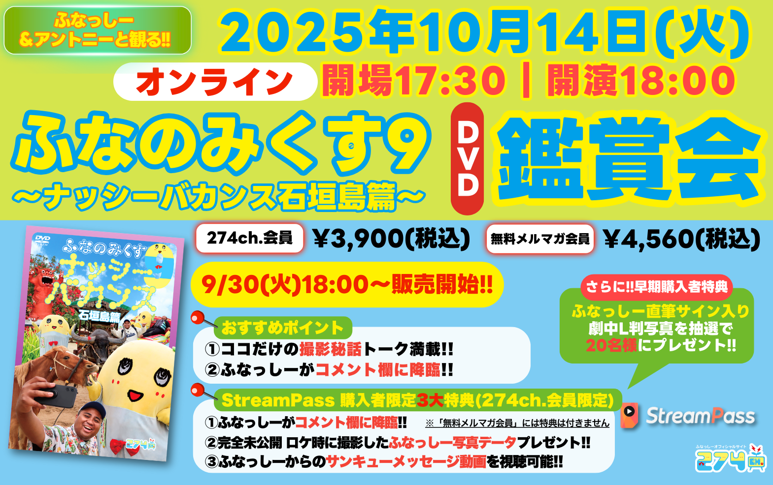 ふなっしー&アントニーと観る!「ふなのみくす9 〜ナッシーバカンス石垣島篇〜」ハイブリッドDVD鑑賞会 オンライン配信チケット販売開始!(早期購入者特典あり!)
